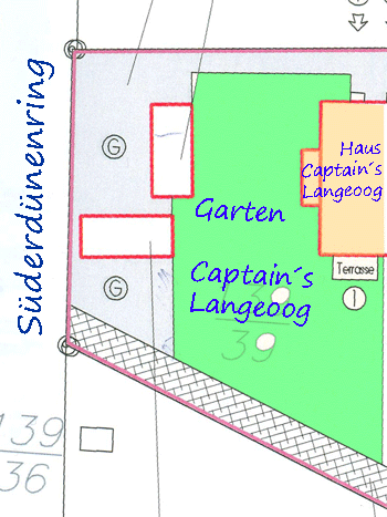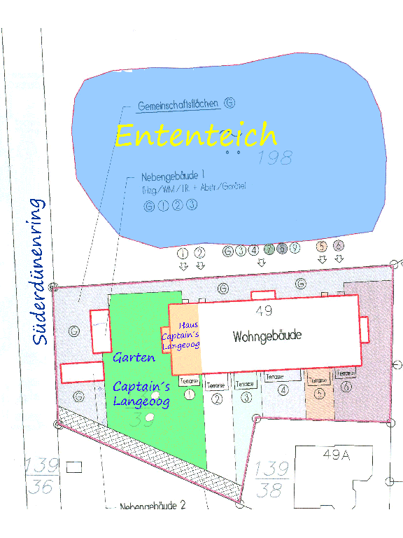 Blick vom Ententeich auf das Wohngebäude - das Endhaus ganz rechts ist "Captain's Langeoog".
