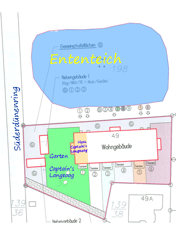 Blick vom Ententeich auf das Wohngebäude Nordseite