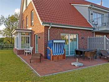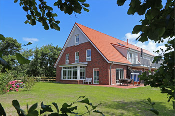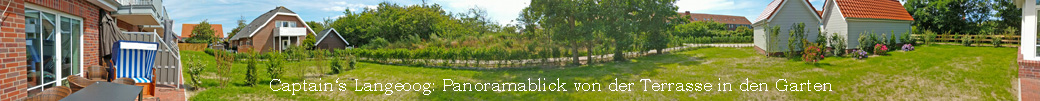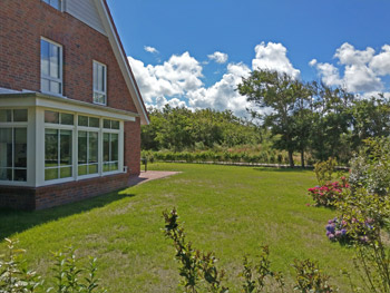 Westseite mit großem Gartenbereich, Terrassen, Sitzgruppe, Strandkorb, vielen Fenstern, Balkon