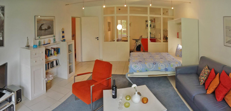 Hier haben Sie den Überblick über Ihren Wohnraum (hier mit ausgeklapptem Schrankbett für Kurzzeitgäste) mit Küche