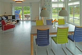 | Der Essbereich ist nach drei Seiten großzügig mit Fenstern geöffnet -
