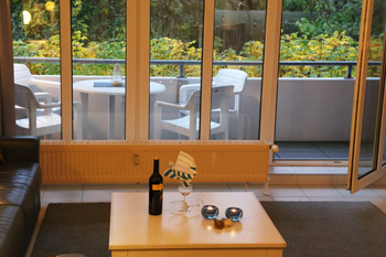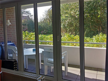 Blick von der Sitzgruppe des Studios: Schauen Sie ruhig mal raus und lassen sich vom schönen Balkon locken...