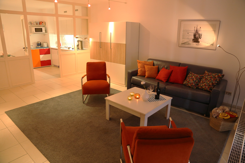 Hier sehen Sie das geschlossene Schrankbett- und können einen Blick in den Küchenbereich werfen. Zwei bequeme stylische, leicht verschiebbare Sessel erlauben ermöglichen eine flexible Sitzanordnung. |