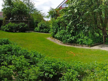 Die Wohnung ist lediglich vom ruhigen, kaum frequentierten Gartenbereich, nicht aber von anderen Häusern aus einsehbar. Der nach Südwesten gerichtete große Balkon (6 m²) lädt zum Verweilen, Lesen und Genießen ein. |