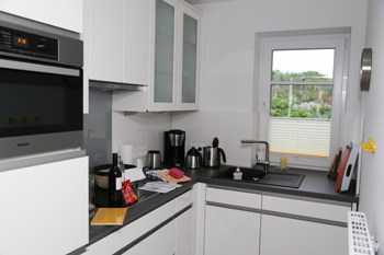 Die Küche öffnet sich zum Essbereich - das Fenster hat Dünenblick