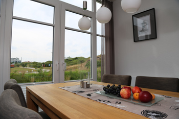 Genießen Sie den weiten Blick vom Esstisch auf Rasenflächen und Dünen nach Westen